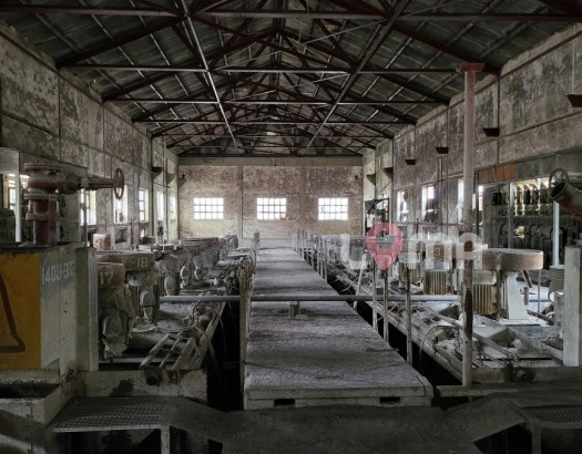 철제 구조물의 천장과 시멘트벽이 그대로 보이는, 정리 된 폐공장 실내