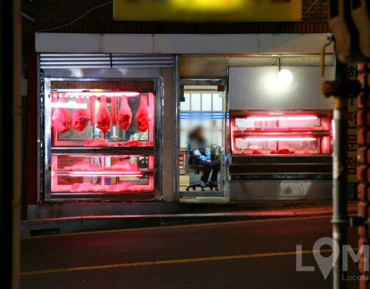 붉은 불빛에 노란 간판, 어쩐지 으스스한 정육점