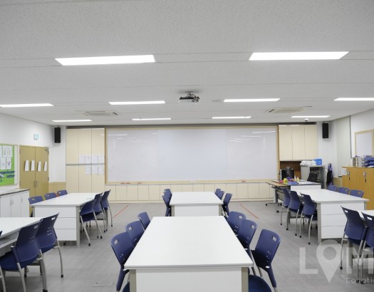 큰 화이트보드 칠판이 눈에 띄는 강의실.