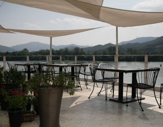 강 근처 갤러리와 레스토랑, 방이 함께 있는 전망 좋은 건물(2층)
