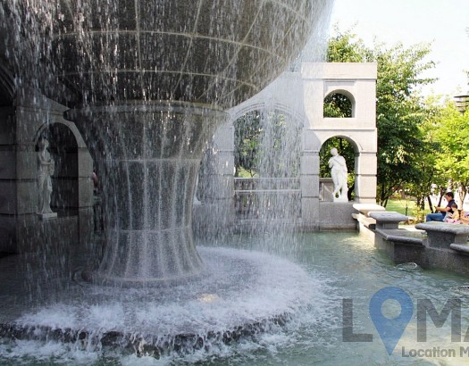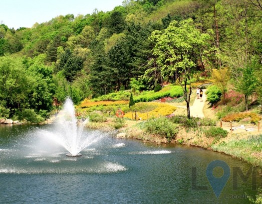 울창한 나무 속 호수와 작은 분수