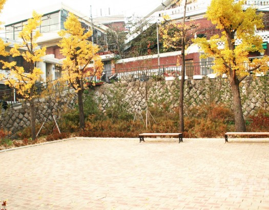 가을의 아늑함을 느낄 수 있는 벤치와 돌담벽