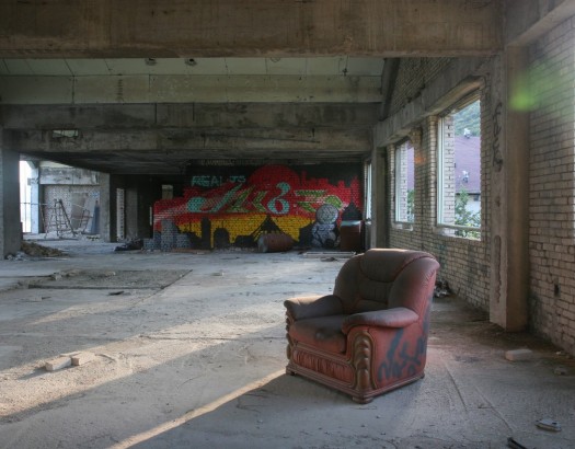 벽돌과 시멘트로 이루어진 강가 옆 폐건물 (3층)
