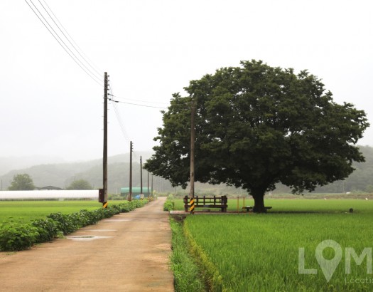 시골 뚝길과 밭 사이에 나무 한그루 포인트와 벤치와 평상
