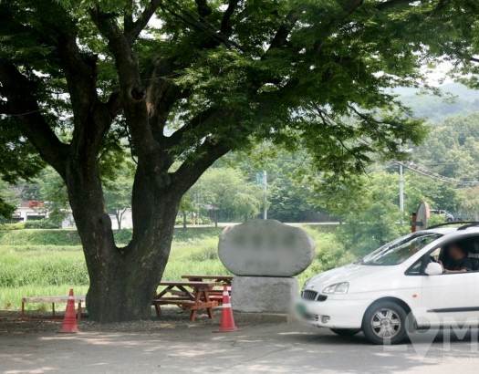 시골 뚝길과 밭 사이에 나무 한그루 포인트와 벤치와 평상