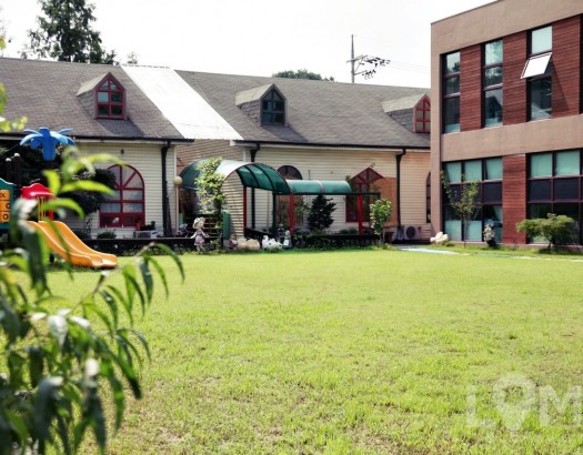 작은 미끄럼틀이 있는 건물 사이 잔디밭