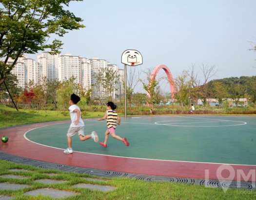 아파트가 배경으로 보이는 잔디 밭 넓은 공원