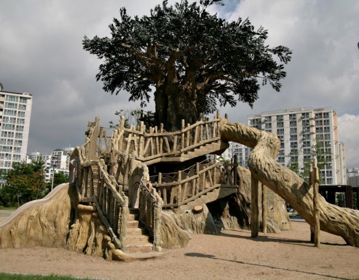 이국적느낌 물씬 풍기는 자연친화 컨셉의 나무에 지어진 놀이터