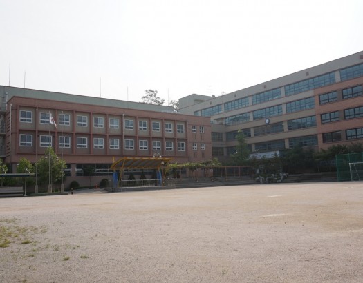 붉은 벽돌의 깔끔한 외관과 넓은 운동장을 갖춘 학교(외관)