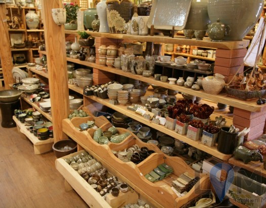 원목과 어우러진 도자기 진열 가게