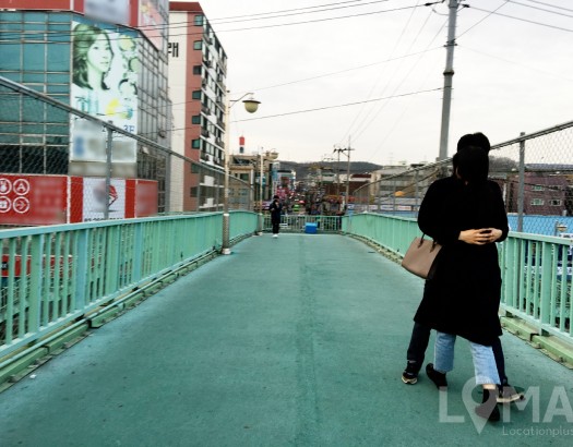 초록색의 양쪽 골목과 깊이감이 있고 펜서가 쳐진 육교