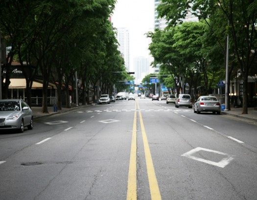 한적하고 가로수가 펼쳐진 깔끔한 도심 도로