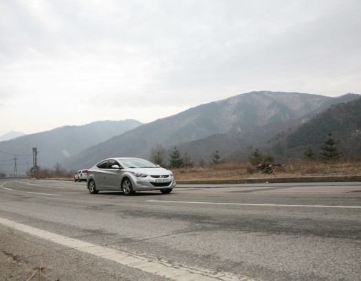 자연풍경으로 뒤에 산이보이는 넓은 커브도로 차량 주행 스팟