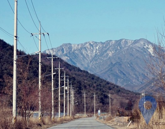 아주 넓은 평야와 큰 산기슭, 전봇대가 그림을 이루는 도로