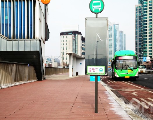 나무데크 바닥과 옆의 질감이 느껴지는 건물의 버스 정류장