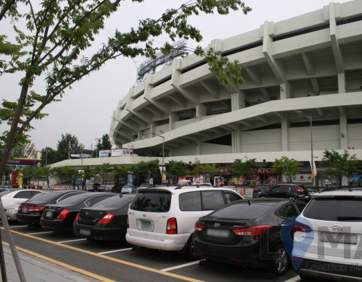 경기장 앞 넓은 야외 주차장