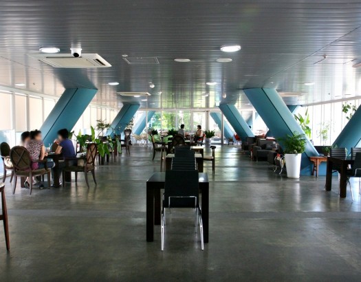 사선 기둥의 인테리어와 통창이 있는 학교 내 북카페