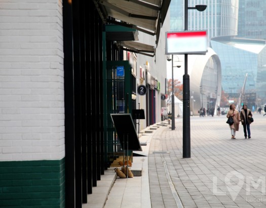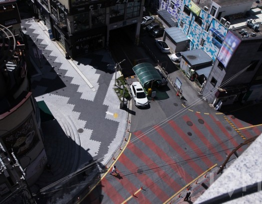 횡단보도와 빌딩 중간에 있는 전광판을 함께 잡을 수 있는 구도