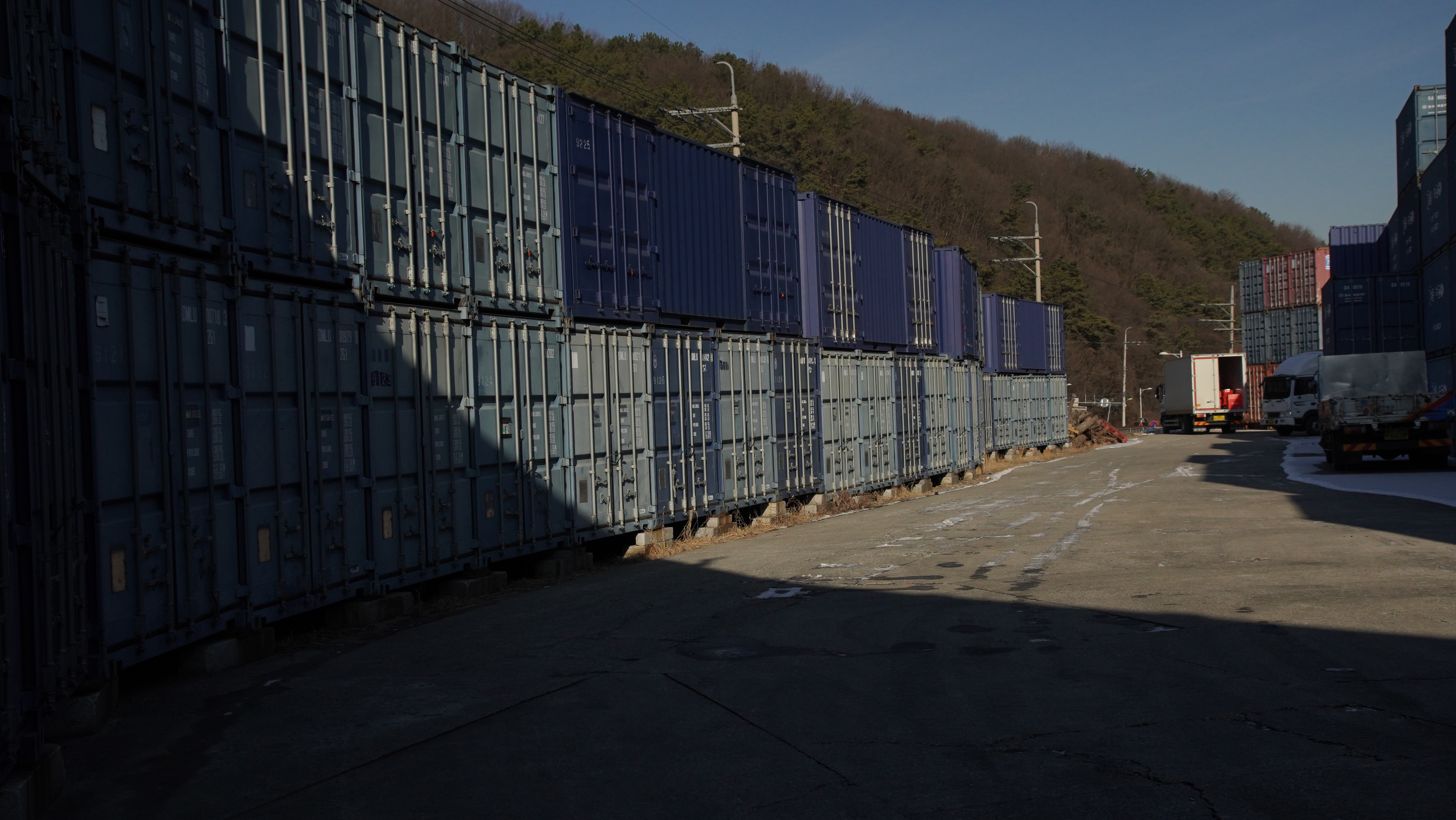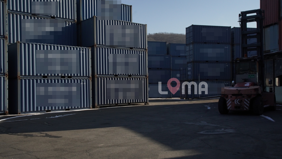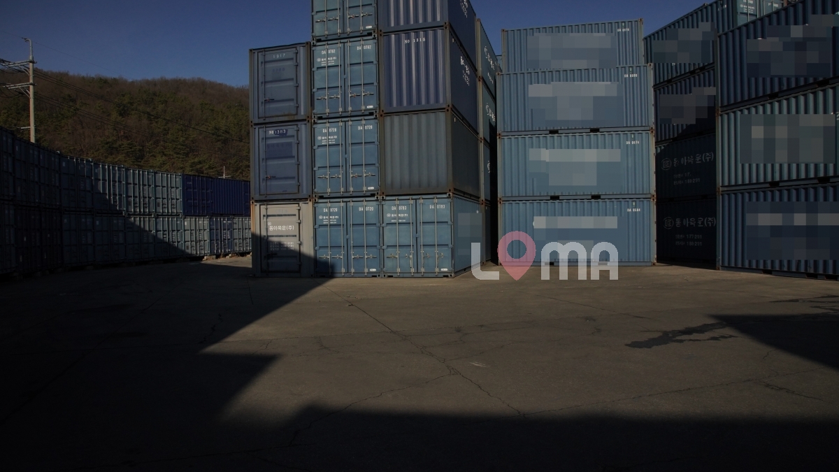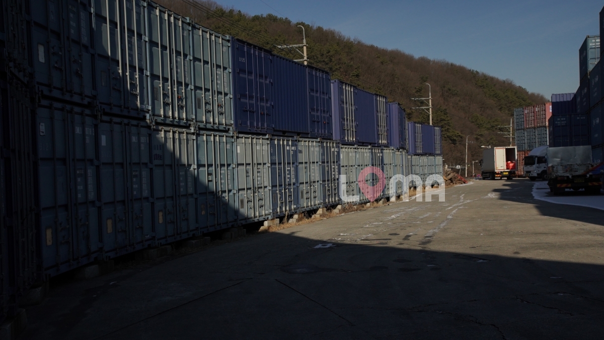 산 아래 넓은 주차장이 있는 컨테이너 창고