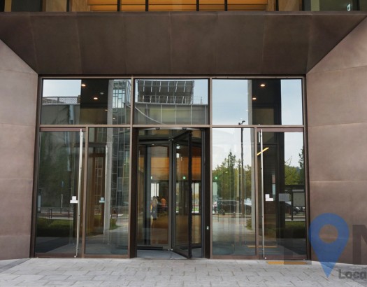 깔끔하고 어두운 톤의 건물 입구, 로비