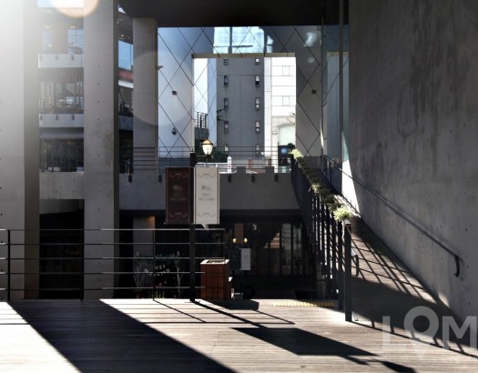 주인공을 돋보이게 하는, 회색 구조물과 나무계단