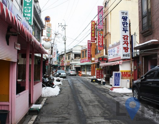 허름한 골목에 간판들이 늘어선 주택가 거리