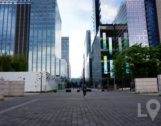 높은 빌딩 숲 사이의 광장과 거리