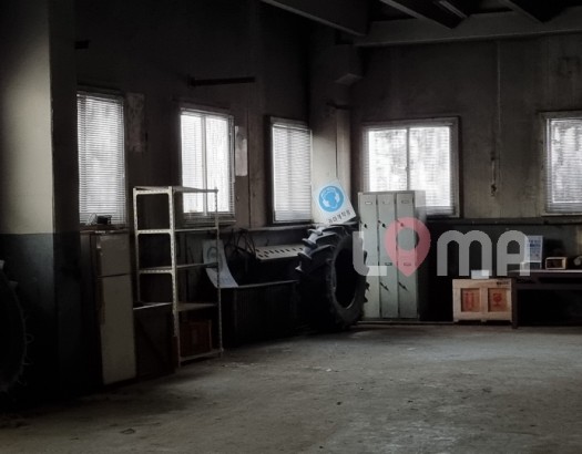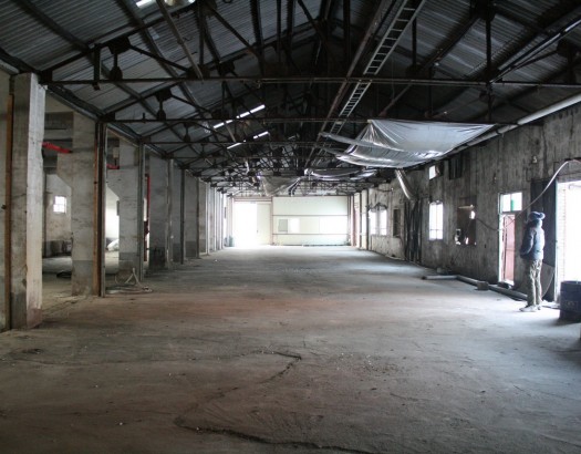 철제 구조물의 천장과 시멘트벽이 그대로 보이는, 정리 된 폐공장 실내