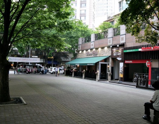 나무 아래서 휴식을 취할 수 있는 넓은 광장(카페, 레스토랑 상가 거리)