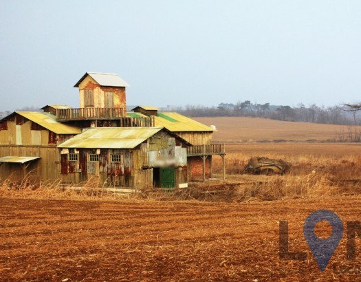 목장에 있는 목재 집이나 창고 느낌의 빈티지 건물 (겨울)
