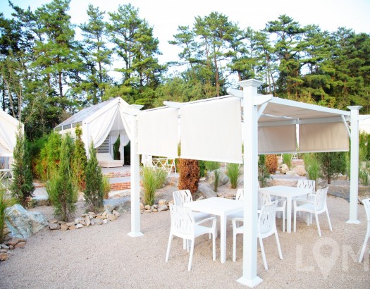 모래밭과 나무데크의 야외 글램핑
