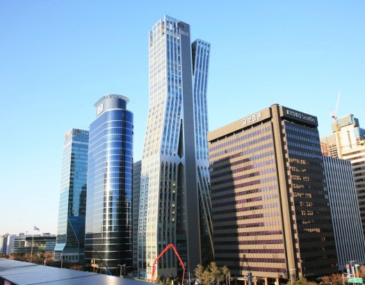 도심 사거리와, 아래서 올려다 보는 고층 빌딩, 그리고 테라스가 있는 건물 옥상(옥상)