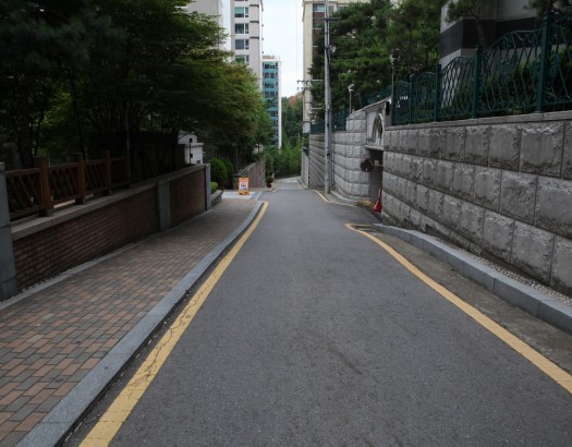 언덕진 모던한 주택가에 양쪽에 담벽이 있는 스팟