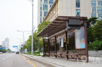 깊이감이 느껴지는 회색 인도와 나무데크 정류장