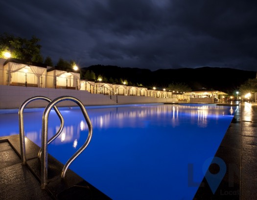 고급스러운 호텔 외관과 멋진 야경을 자랑하는 수영장(밤)