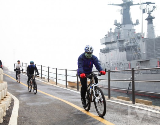 전투함이 놓인 자전거 도로