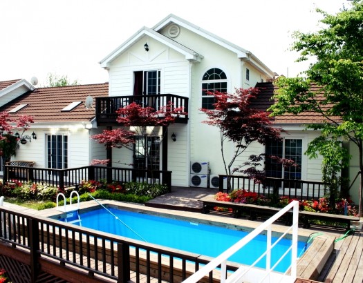 야외수영장이 있는 화이트톤 2층 집