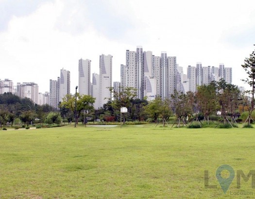 아파트가 배경으로 보이는 잔디 밭 넓은 공원