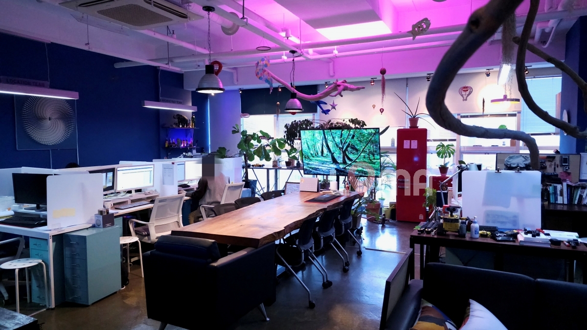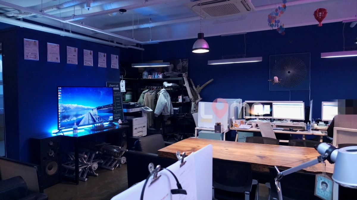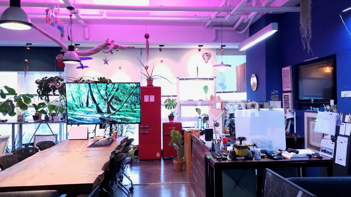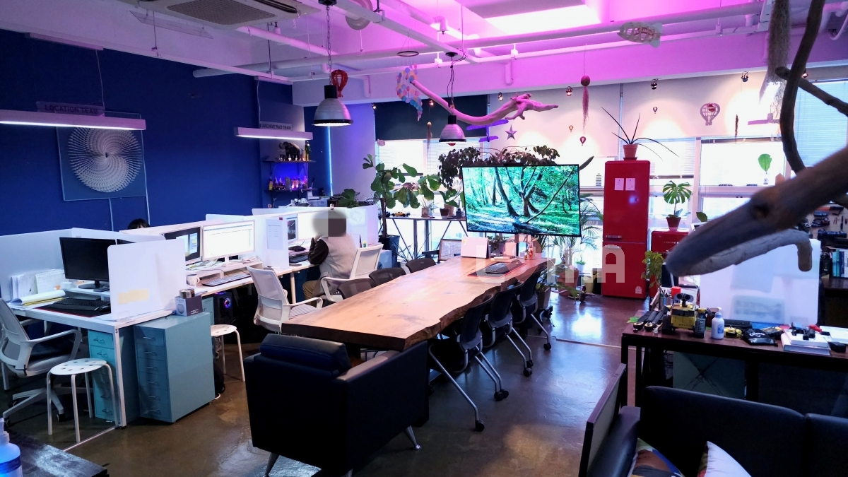 파란 벽지와 핑크보라빛 조명이 매력적인 아기자기한 사무실. 크리에이터들의 업무 공간으로 제격인 곳. 큰 화이트보드, 긴 목재 테이블, 큰 모니터, 칸막이가 쳐져 있는 개개인 업무 공간이 마련되어 있습니다. 사무실 곳곳 다양한 식물, 조명, 소품으로 꾸며져 있어 밝은 느낌의 촬영 스팟으로 적합합니다.