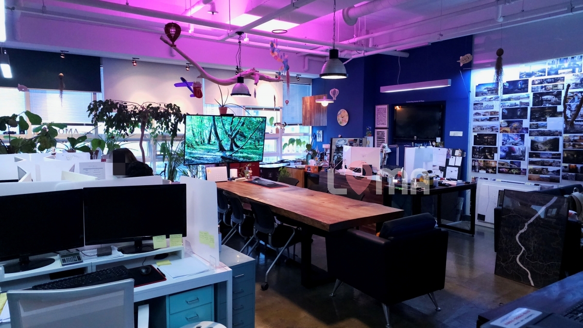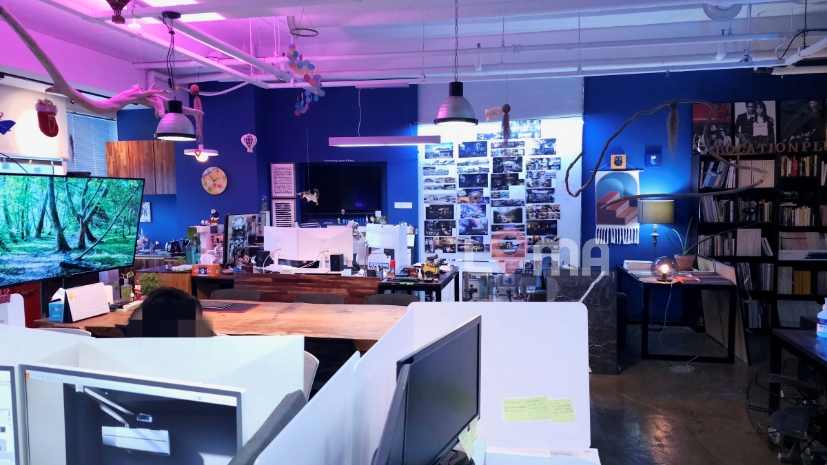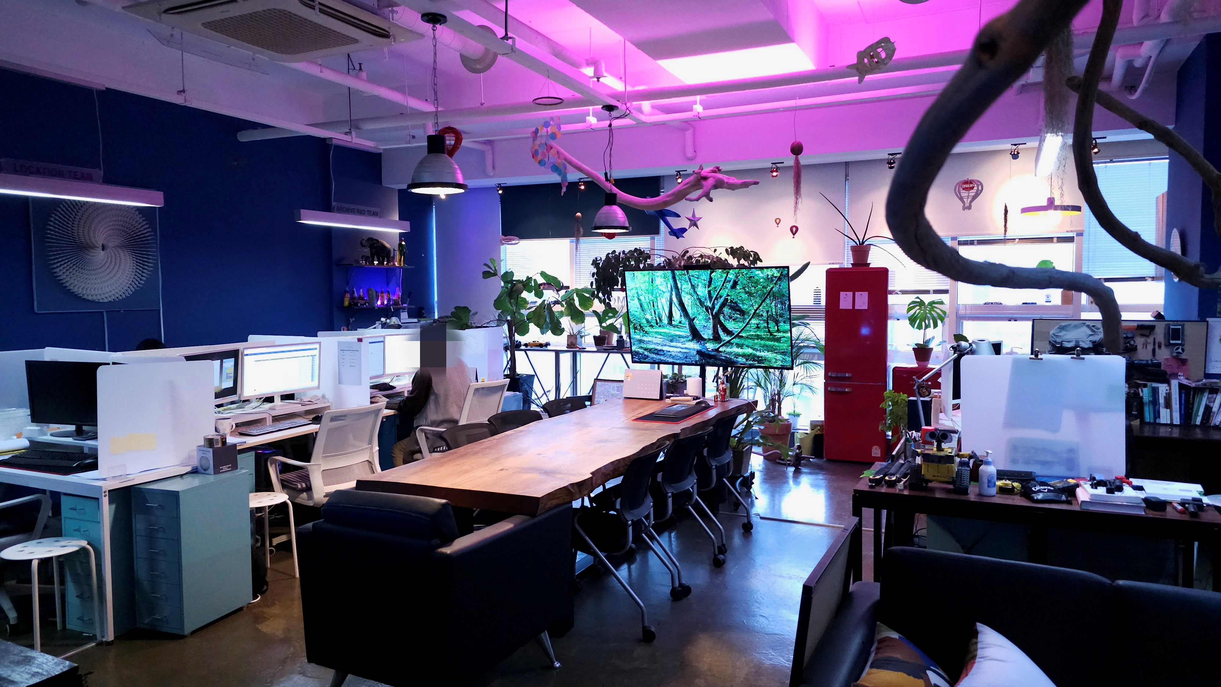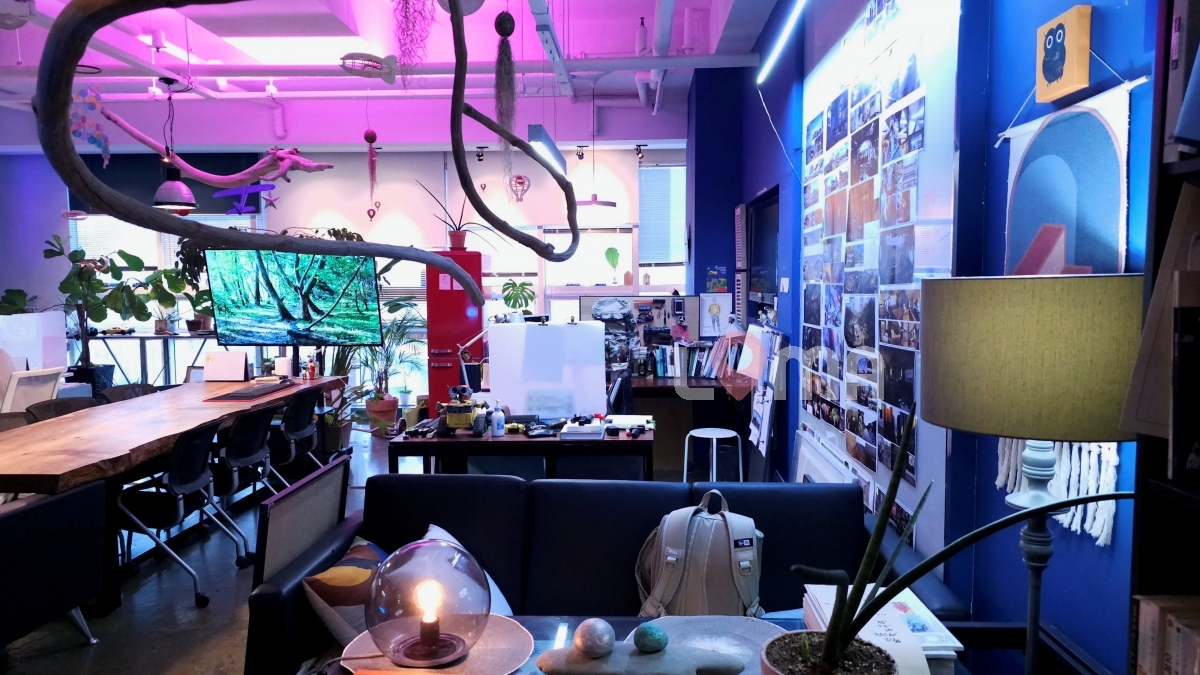 파란 벽지와 핑크보라빛 조명이 매력적인 아기자기한 사무실. 크리에이터들의 업무 공간으로 제격인 곳. 큰 화이트보드, 긴 목재 테이블, 큰 모니터, 칸막이가 쳐져 있는 개개인 업무 공간이 마련되어 있습니다. 사무실 곳곳 다양한 식물, 조명, 소품으로 꾸며져 있어 밝은 느낌의 촬영 스팟으로 적합합니다.