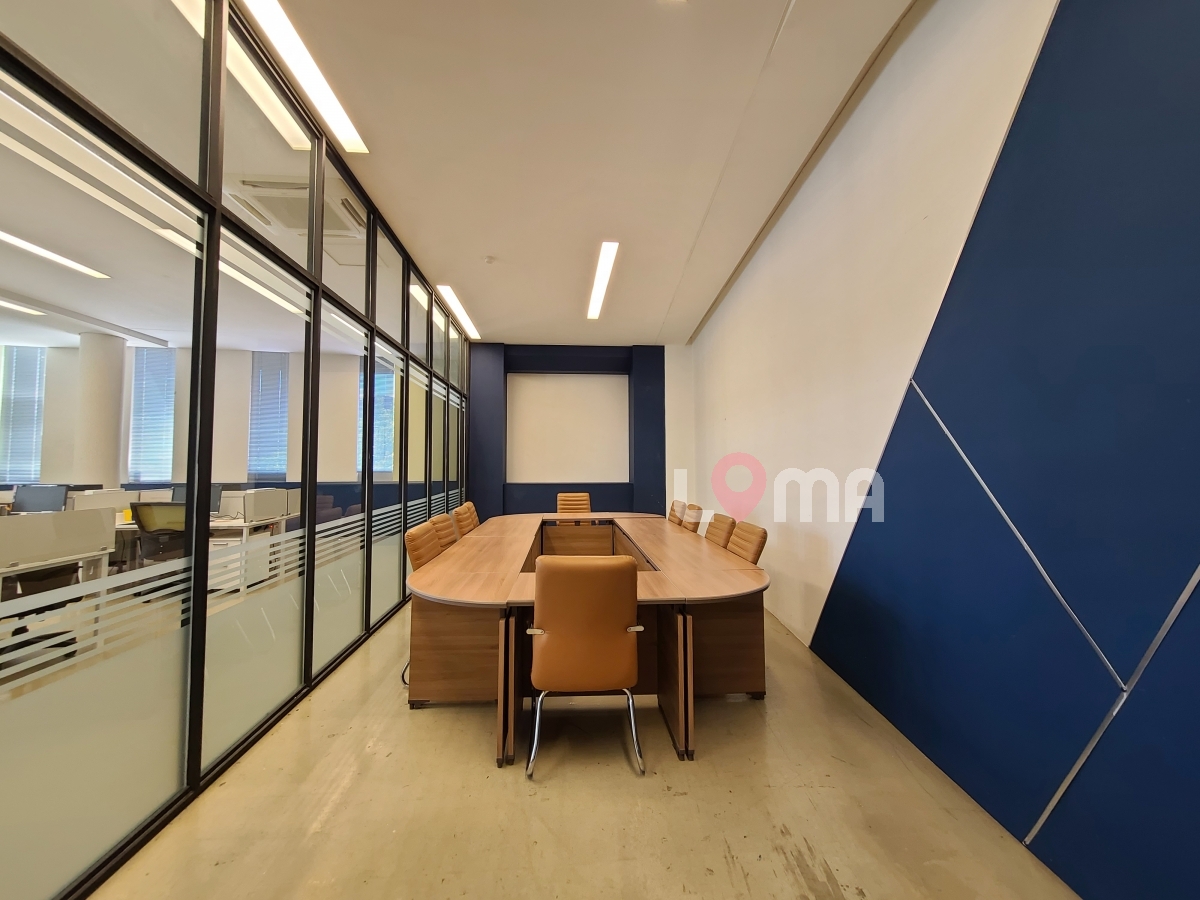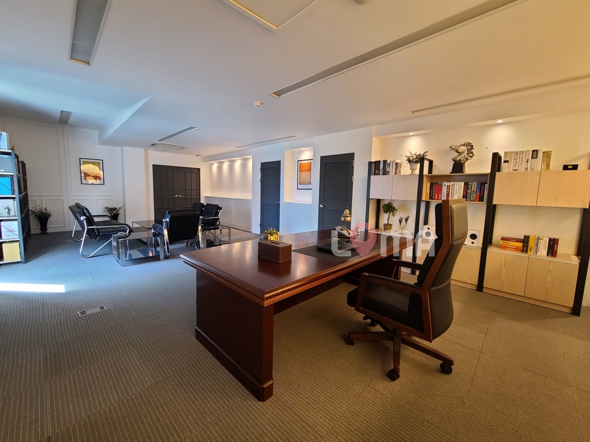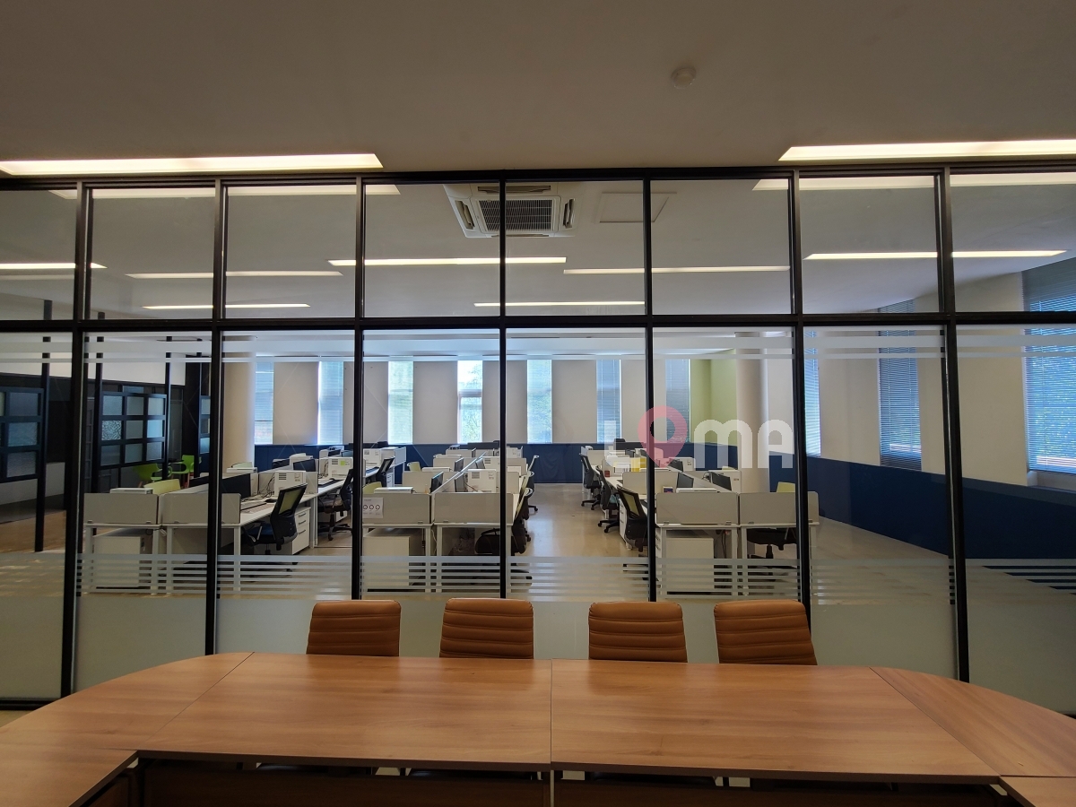 넓고 깔끔한 구조와 통일감 있는 책상 배열 그리고 채광이 좋아 자연광 촬영에도 유리함 유리 파티션으로 구분된 회의실이 있어, 다양한 공간 활용!! 임원실은 고급스러운 인테리어와 간접 조명으로 세련된 무드 연출 가능함 - 현대적이고 조직적인 회사 분위기의 사무실, 일반 직원들의 일상적인 오피스 씬 - 임원실은 임원 인터뷰나 회의, 고급스러운 비즈니스 씬