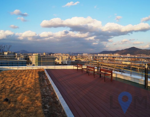 지하철이 지나는 모습이 보이는 깔끔한 옥상