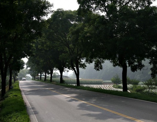 도로 양 옆으로 이어진 나무들과 물결모양 논이 보이는 이차선 시골도로