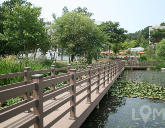연못과 나무데크가 조화를 이룬 산책로